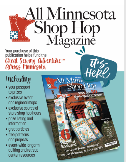We are gearing up for this year's ALL MINNESOTA SHOP HOP. Magazines should arrive mid to late February. The Magazines are your passport to the Shop Hop and contain the map of all participating shops and exclusive patterns designed by Minnesota shops. Magazines are $13.95 You can pre-order online or in the shop, and we will save your magazine for you.